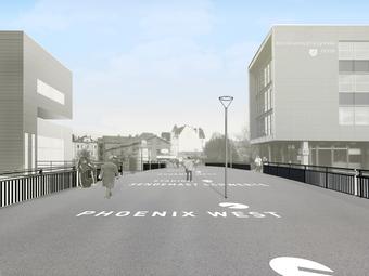 Allerdings ist sie auch kein Raum für gesichtsloses Durchhuschen! Markierungen und Beschriftungen im Asphalt öffnen den Menschen immer wieder unverhofft die Augen; ein kurzes Innehalten und Aufschauen, der Blick in die Ferne lohnt sich. Den Blick zum ehemaligen Stahlwerk Phönix West, zum neuen PHOENIX See, zum BVB-Stadion, in den Schwerter Wald und noch viel mehr haben die Hörder Stadtansichten zu bieten.