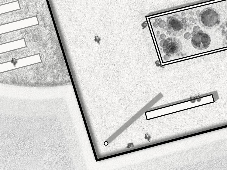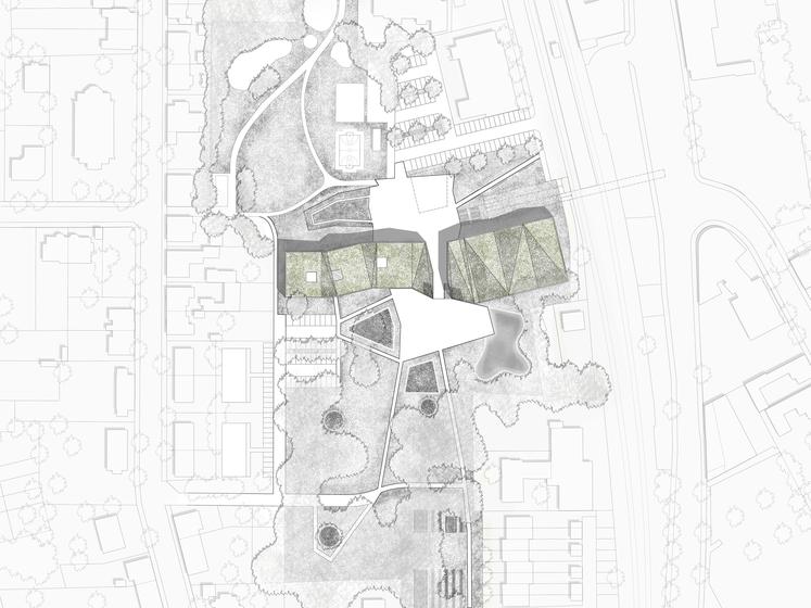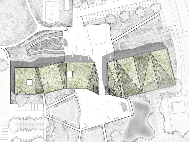 Der Beitrag überrascht mit einer spannungsvollen Setzung, die mit einem freigeformten Gebäude den Park bewusst in zwei unterschiedliche Räume und Topographien teilt. »Es führt kein Weg an mir vorbei«, signalisiert das Gebäude, das sich mit seinem gefalteten Gründach als begehbare Landschaft anbietet. Das Gebäude markiert die topographische Kante und lockt Besucher/innen und Nutzer/innen durch eine offene Fuge an die Balkonkante mit Blick in die untere Ebene. Die eingelassene Treppe, die wenig großzügig dimensioniert ist, führt auf den unteren Quartiersplatz bzw. Schulhof, korrespondierend zu dem oberen Platz, der den Zugang vom Markt aus auffängt. Die Plätze sind einladend und großzügig. Im gesamten Waldpark werden zudem unterschiedliche Freiraumlabore zum Entdecken eingestreut.
