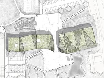 Der Beitrag überrascht mit einer spannungsvollen Setzung, die mit einem freigeformten Gebäude den Park bewusst in zwei unterschiedliche Räume und Topographien teilt. »Es führt kein Weg an mir vorbei«, signalisiert das Gebäude, das sich mit seinem gefalteten Gründach als begehbare Landschaft anbietet. Das Gebäude markiert die topographische Kante und lockt Besucher/innen und Nutzer/innen durch eine offene Fuge an die Balkonkante mit Blick in die untere Ebene. Die eingelassene Treppe, die wenig großzügig dimensioniert ist, führt auf den unteren Quartiersplatz bzw. Schulhof, korrespondierend zu dem oberen Platz, der den Zugang vom Markt aus auffängt. Die Plätze sind einladend und großzügig. Im gesamten Waldpark werden zudem unterschiedliche Freiraumlabore zum Entdecken eingestreut.