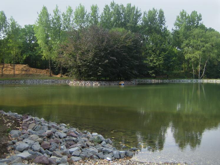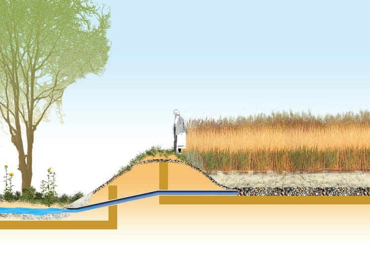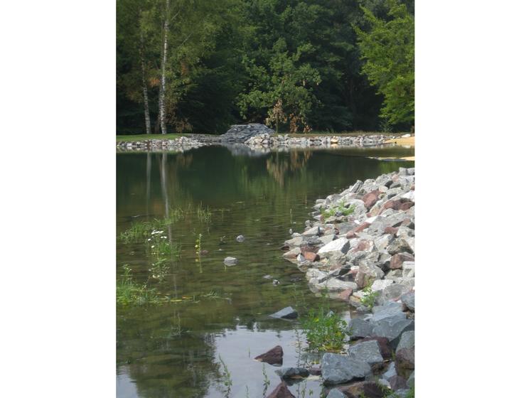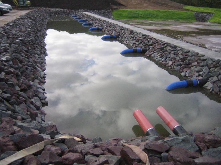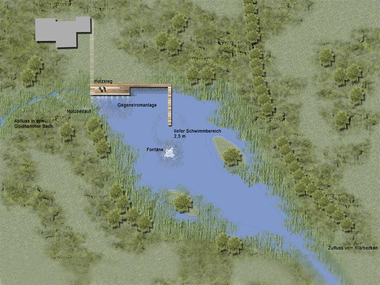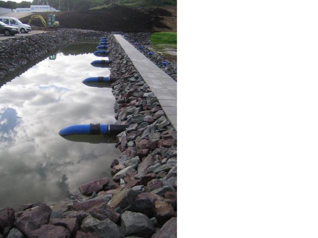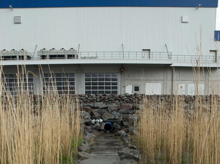 In offenen, das Betriebsgelände umlaufenden Rinnen wird ankommendes Regenwasser gesammelt und an einen Retentionsbodenfilter übergeben. Von dort gelangt das gereinigte Regenwasser in einen naturnah ausgeformten Teich. Wasserüberschuss wird über ein Drosselbauwerk in einen bestehenden Bach geleitet.