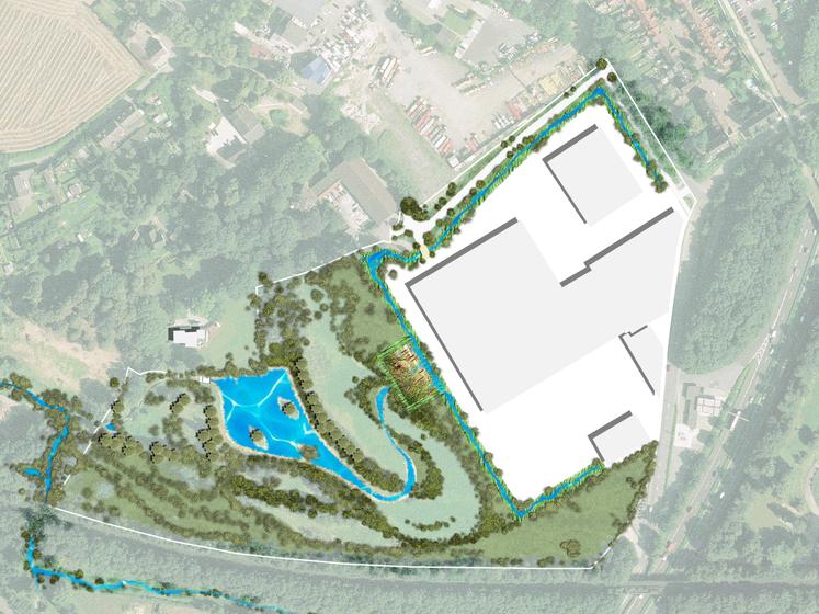 Landschaft planen + bauen erarbeitete die Umsetzung des Landschaftspflegerischen Begleitplanes sowie die Abkopplung des Regenwassers auf dem Firmengelände.