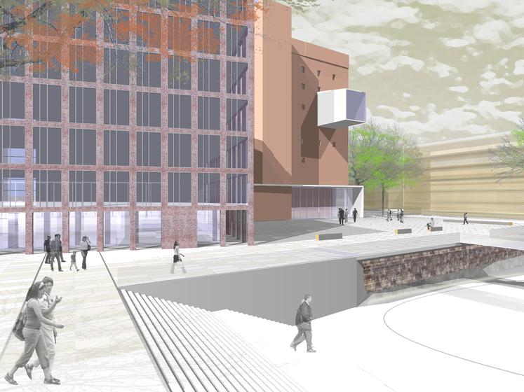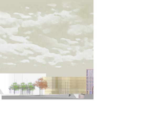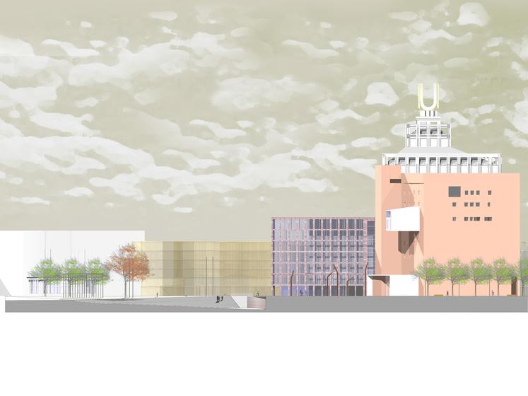 Die Verknüpfung mit der City geschieht durch das "Westband", einen geometrisch gefassten Freiflächenzug in Ost-West-Richtung mit Sichtbezügen über den Wall hinweg. Es bildet zugleich die Grundlinie der "Plattform U", des Platzsystems rund um das U. Bestehende Neubauten jüngeren Datums wie der Bürobaukörper oder die Stadtbahnbauten werden subtil in den neuen Städtebau integriert.