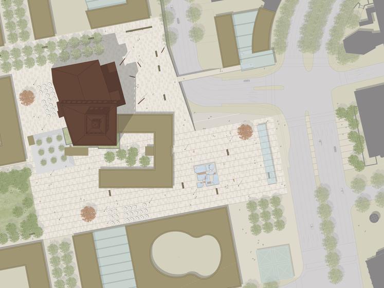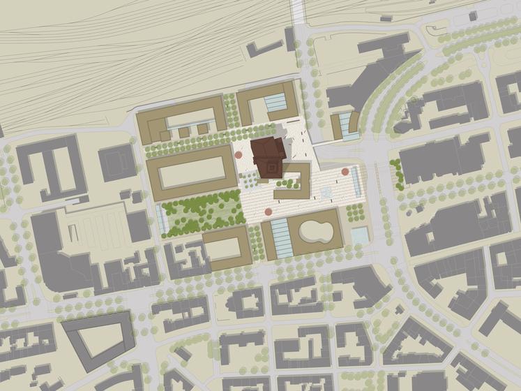Die Freiflächen bilden mit dem Städtebau formal und funktional eine aufeinander abgestimmte Einheit. Sie folgen seiner Orthogonalität und lassen trotz einheitlicher Textur eine klare Hierarchie erkennen, die in der Plattform des U ihren Höhepunkt findet.