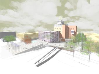 Die Verknüpfung mit der City geschieht durch das "Westband", einen geometrisch gefassten Freiflächenzug in Ost-West-Richtung mit Sichtbezügen über den Wall hinweg. Es bildet zugleich die Grundlinie der "Plattform U", des Platzsystems rund um das U. Bestehende Neubauten jüngeren Datums wie der Bürobaukörper oder die Stadtbahnbauten werden subtil in den neuen Städtebau integriert.