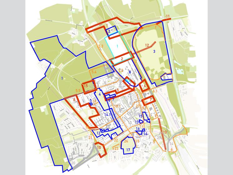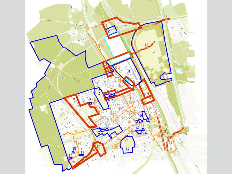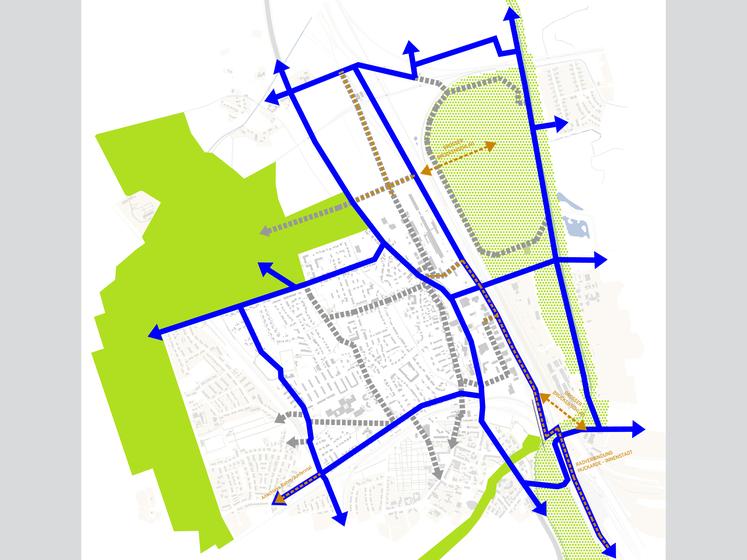 Im zweiten Schritt erfolgte die Entwicklung von konzeptionellen Lösungsansätzen zur Weiterentwicklung und künftigen Ausgestaltung der Freiflächen und Wegeverbindungen sowie deren Darstellung auf Ebene des gesamten Stadtumbaugebietes (Bezugsraum); insbesondere