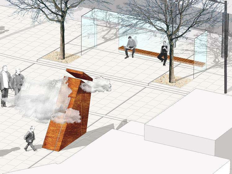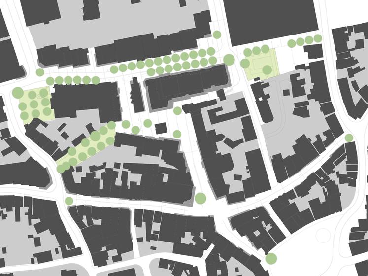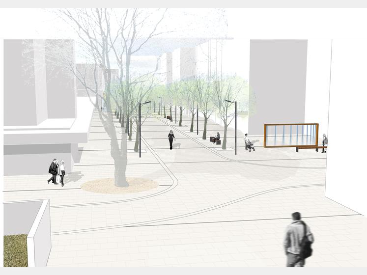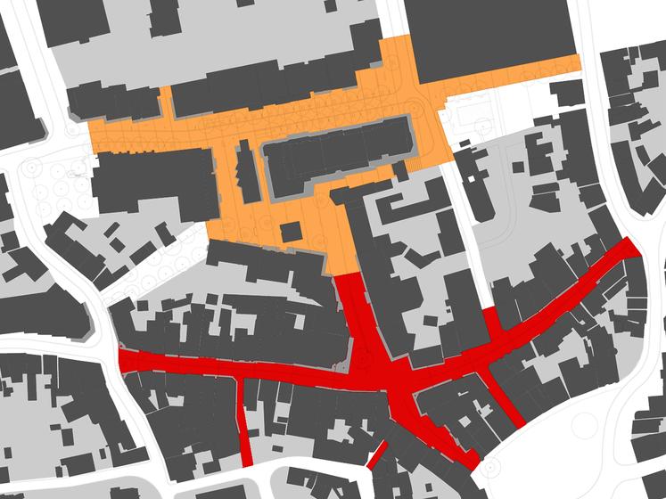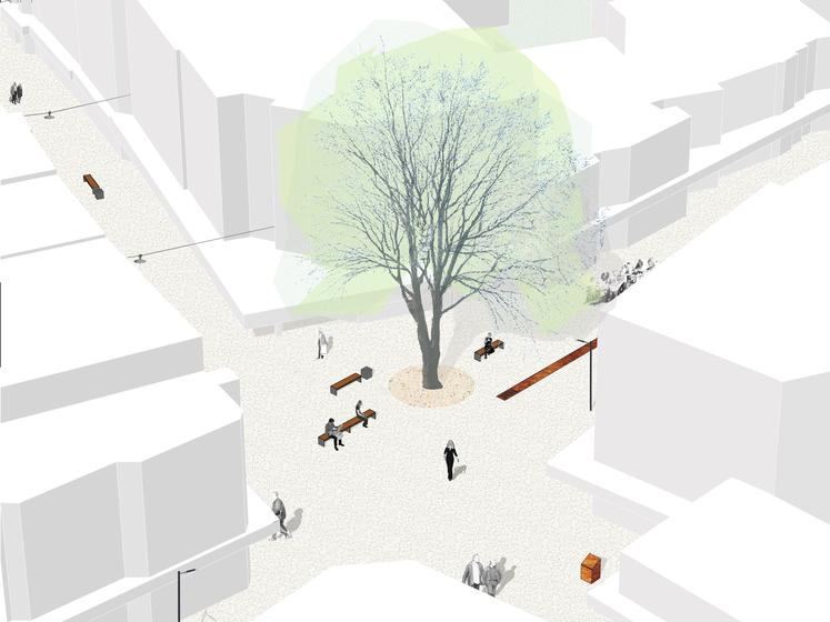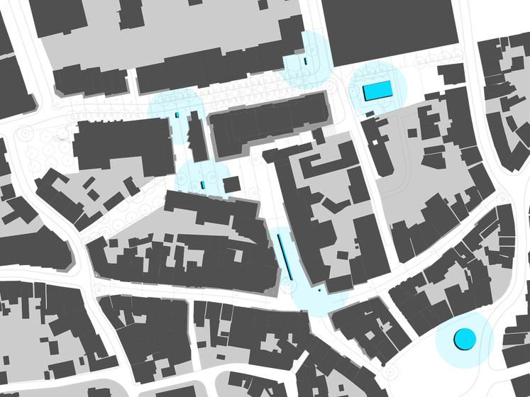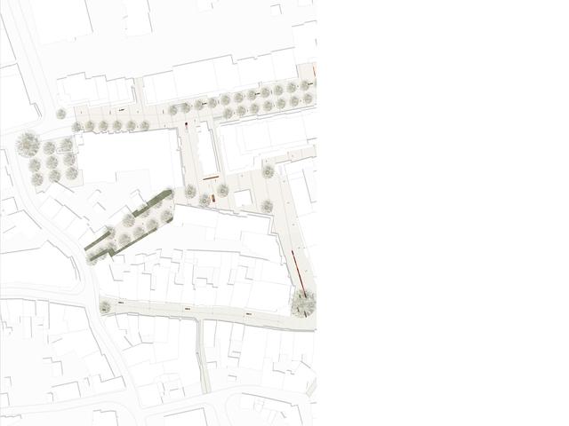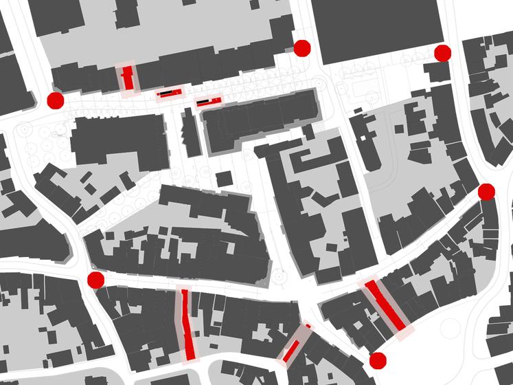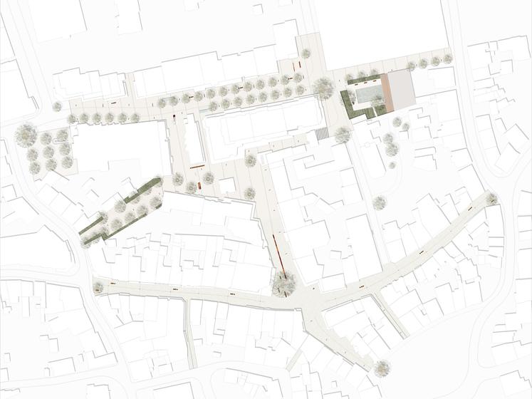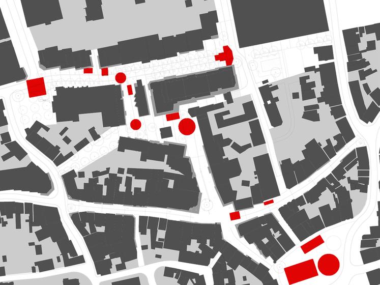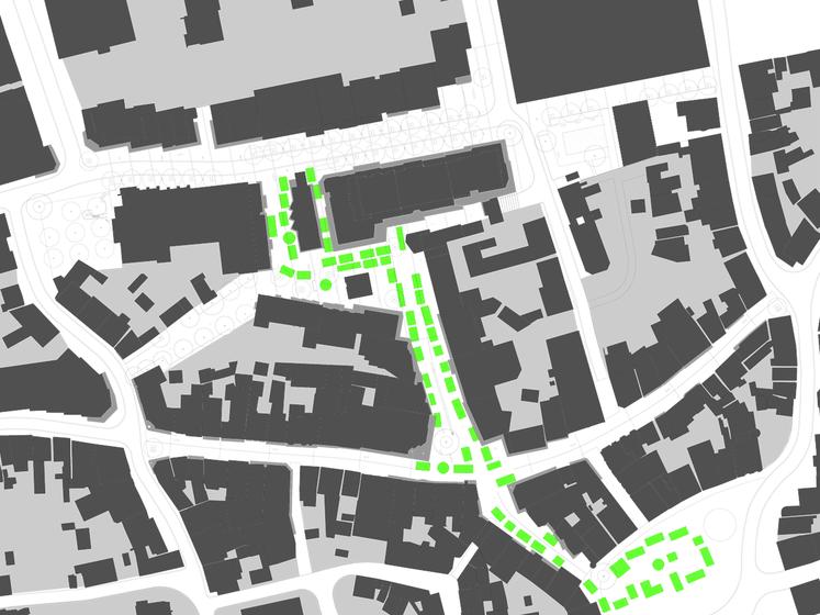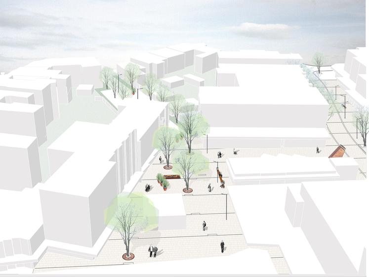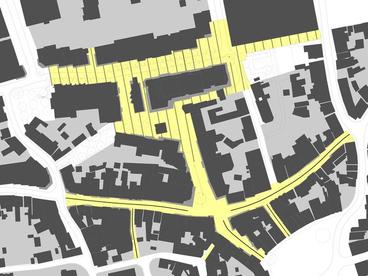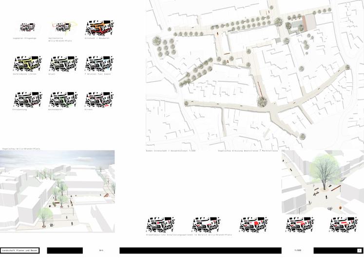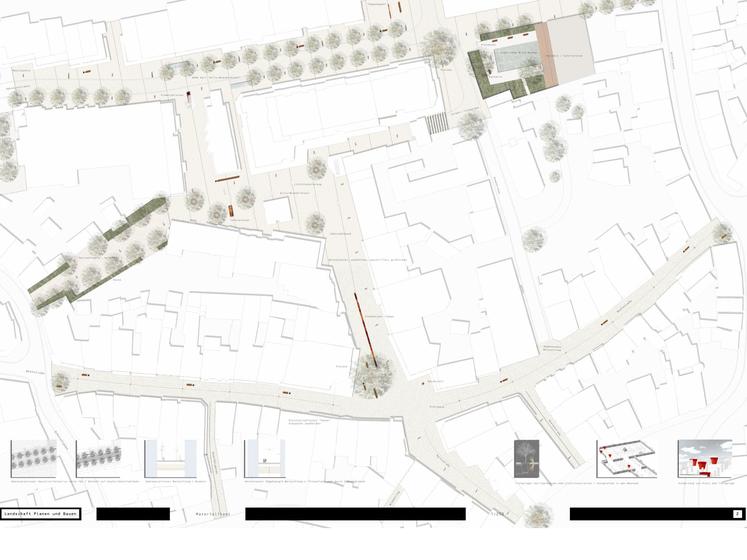 Wettbewerbsaufgabe war die Neugestaltung der Fußgängerzone(n) der Kamener Innenstadt. Der Beitrag von Lp+b thematisiert den Dialog "Altstadt" "Neustadt".