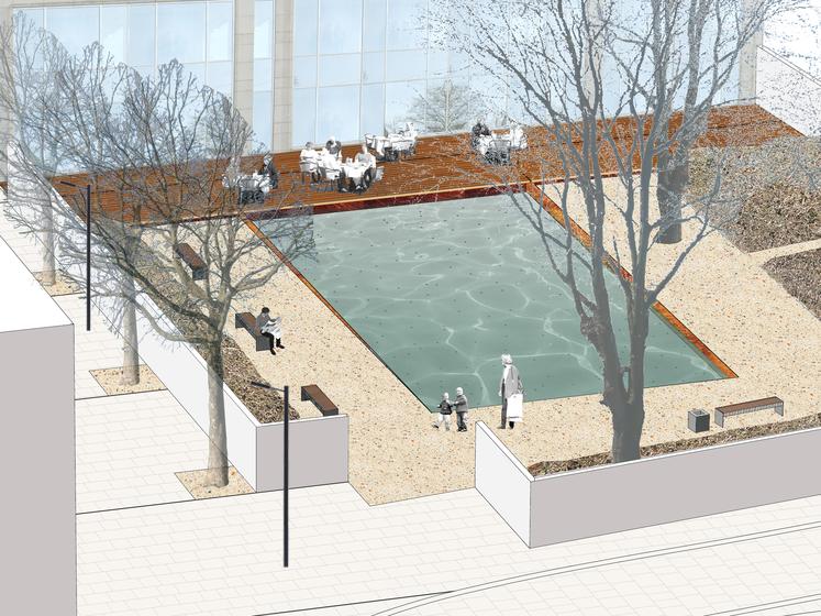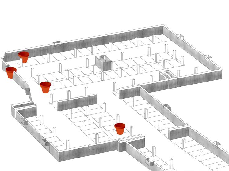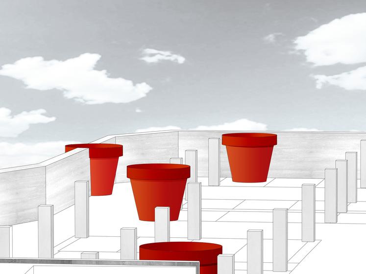 Bauliche Besonderheit sind die übergroßen Blumentöpfe in der Tiefgarage für die Pflanzung von Bäumen auf der Oberfläche.