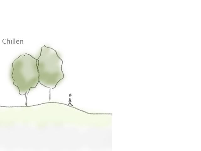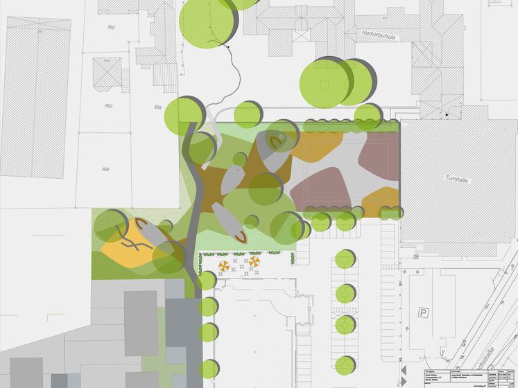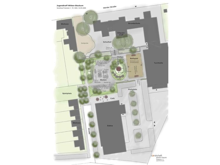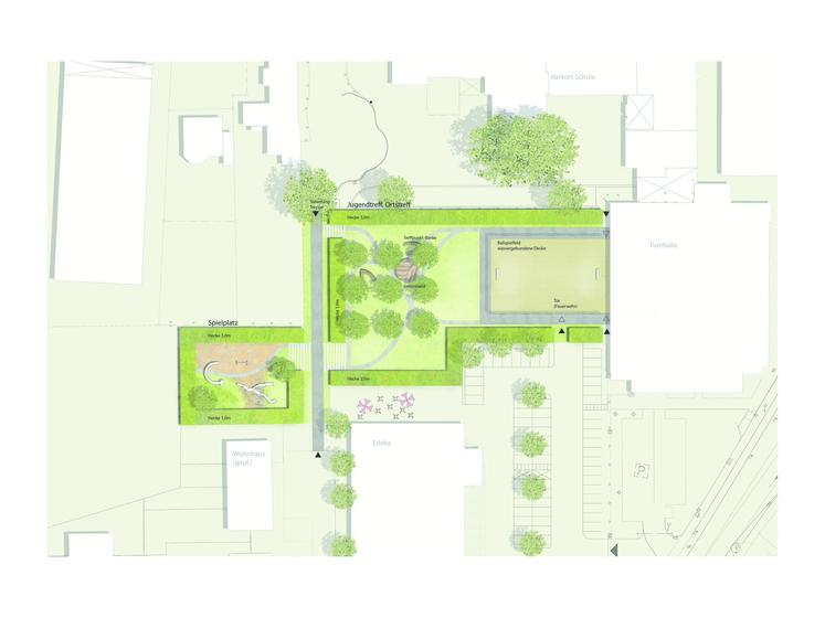 Die Planung sieht eine modulhaft orthogonale Aufteilung der Flächen in Spielplatz, kombinierten Jugendtreff / Ortstreff (Marktplatz) und Ballspielplatz vor.