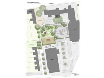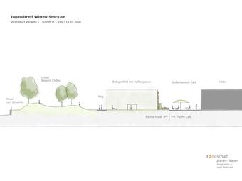 Die Planung sieht eine modulhaft orthogonale Aufteilung der Flächen in Spielplatz, kombinierten Jugendtreff / Ortstreff (Marktplatz) und Ballspielplatz vor.