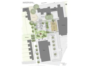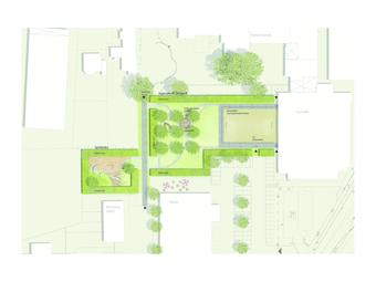 Dabei werden alle Module durch klare Heckenstrukturen gefasst. Die äußere fußläufige Erschließung erfolgt durch eine kurze Wegeachse von Nord nach Süd, die innere durch „weiche“ Wegeverbindungen zwischen den Modulen; z.B. als wassergebundene Wege.