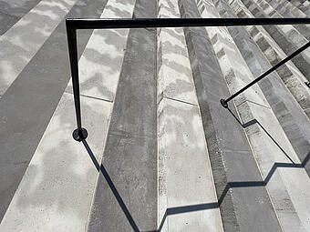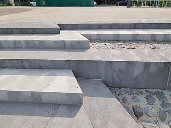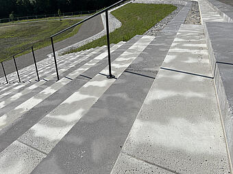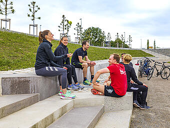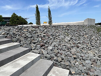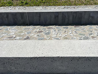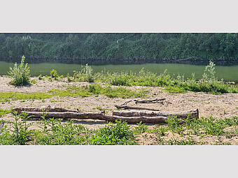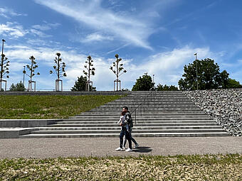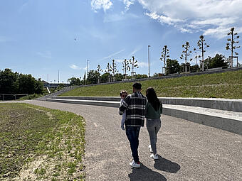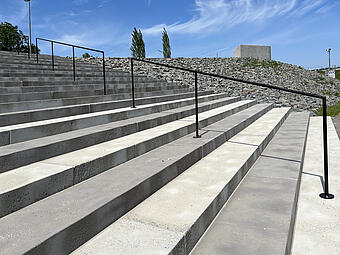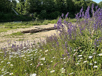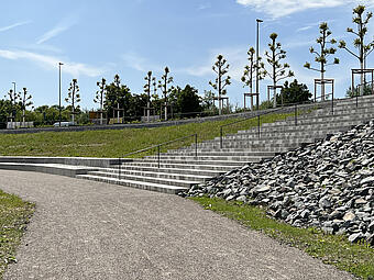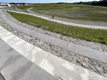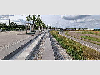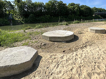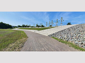 Große Freitreppe mit Platz und Boulderwand im Kontext einer ökologisch umgestalteten Aue, gewässerverträgliche großräumige Bepflanzung und Ufergestaltung