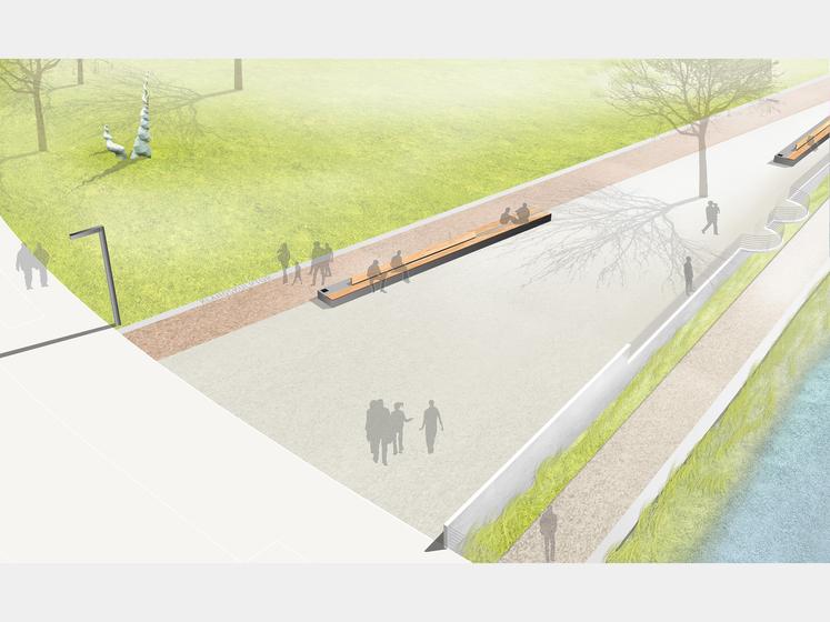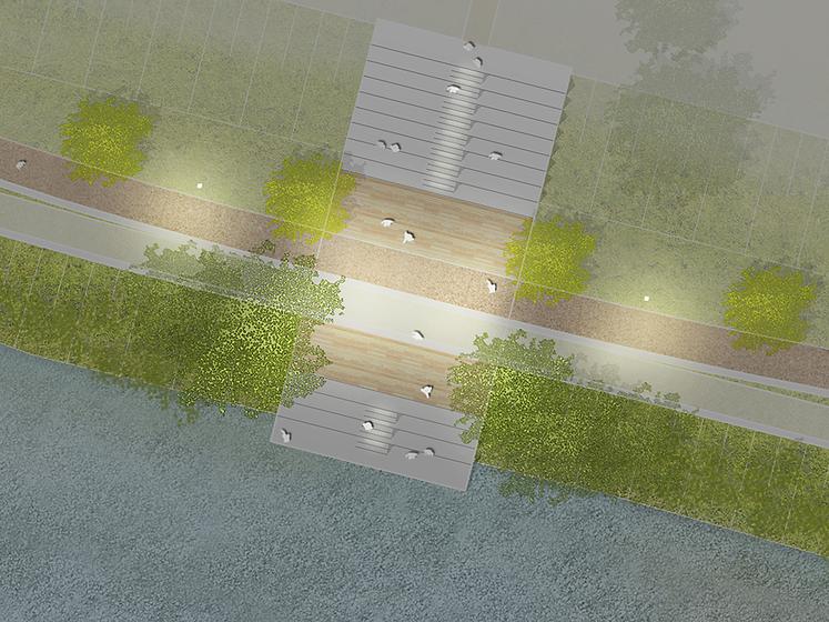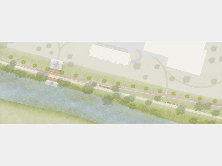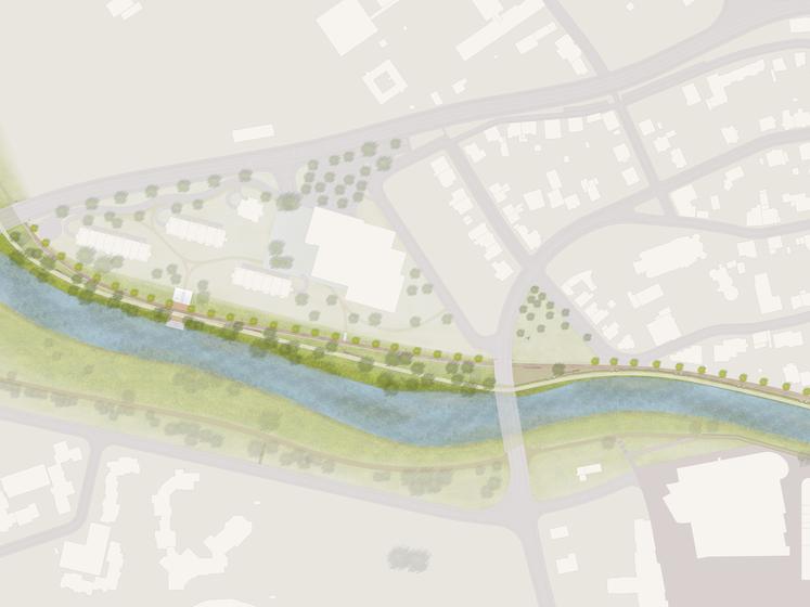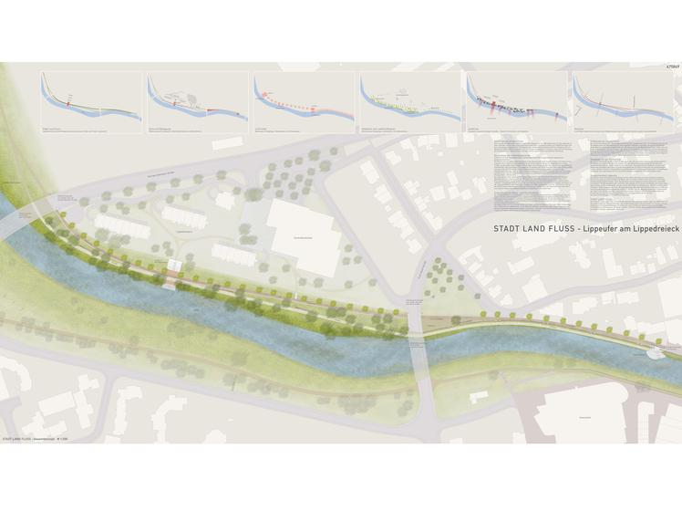 Der Entwurf "Stadt Land Fluss" verbindet die geplante Wohnsiedlung mit der Lippe, die städtischen mit den landschaftlichen Wegebeziehungen und urbane Bedürfnisse nach Aktivitäten im Freiraum mit den Ansprüchen der Gewässerökologie, ohne dass die unterschiedlichen Bedürfnisse nach Urbanität, Privatsphäre und Naturschutz verwässert werden. Vielmehr werden diese gestärkt und an definierten permeablen Punkten miteinander verbunden. Entwurfsbestandteile sind: