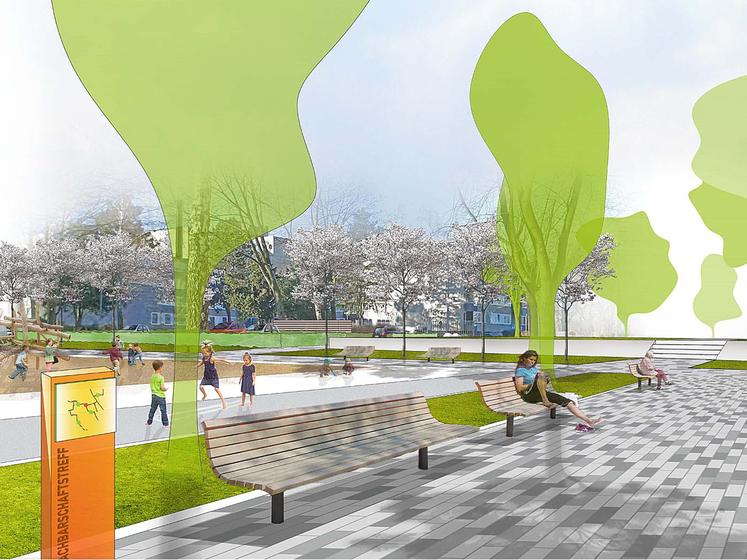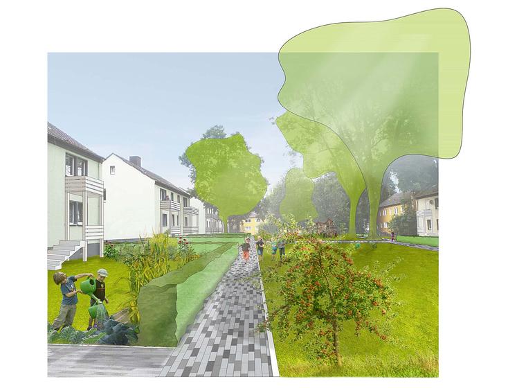 Wesentliche Idee des Konzeptes ist der "Stadtteil der 1000 Gärten", d.h., es wurde vorgeschlagen, große Bereiche der Freiräume in von Mietern genutzte Gärten umzuwandeln. Hierzu wurde im Rahmen einer Exkursion auf die Erfahrungen einer vergleichbaren Großsiedlung in Monheim zurückgegriffen.