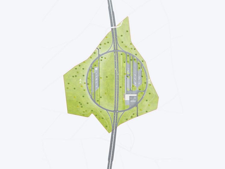 Die zukünftige Rastanlage "Lange Berge" entwickelt über ihren gleichermaßen prägnanten wie intuitiv erfassbaren Grundriss und ihre eine ländliche Gartenstimmung evozierende Freiraumgestaltung einen Typus von Rastanlage, der sich aus dem immer gleichen Bild der derzeitigen Anlagen heraushebt und die Rast als echten Teil der Reise erfahrbar und erinnerbar macht.