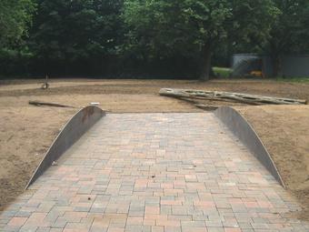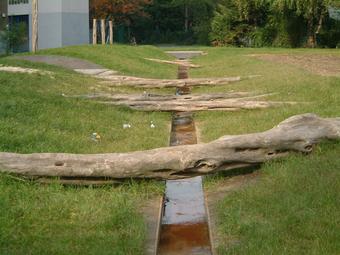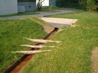 Zugleich wurde die Umplanung der Flächen für das erforderlich gewordene Regenwassermanagement der Gebäude und Flächen genutzt. Es besteht nun die Möglichkeit, den Überschuss des auf dem Gelände zurückgehaltenen Regenwassers in kontrollierter und darüber hinaus in gestalterisch inszenierter Form an einen nahegelegenen Graben abzuleiten.