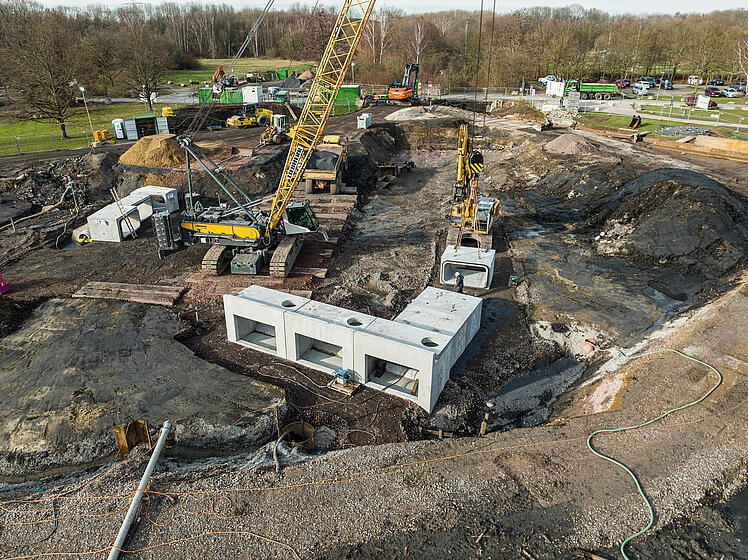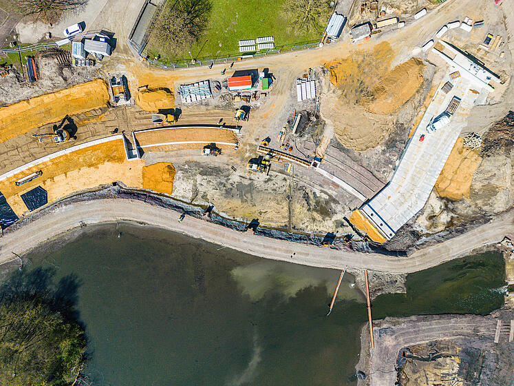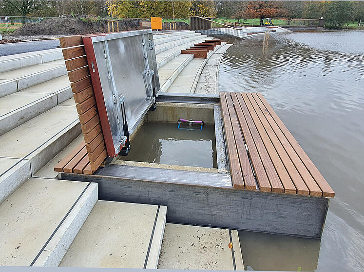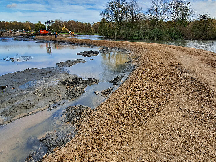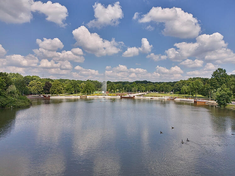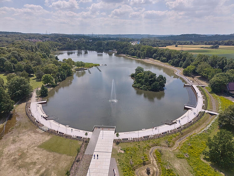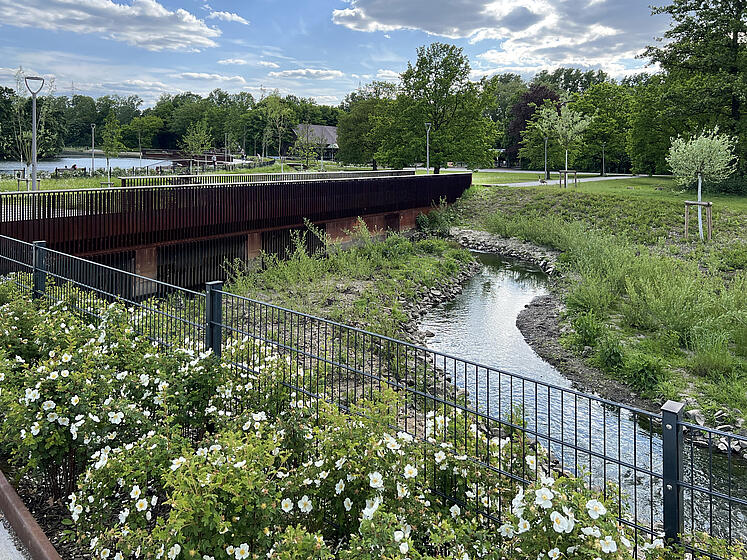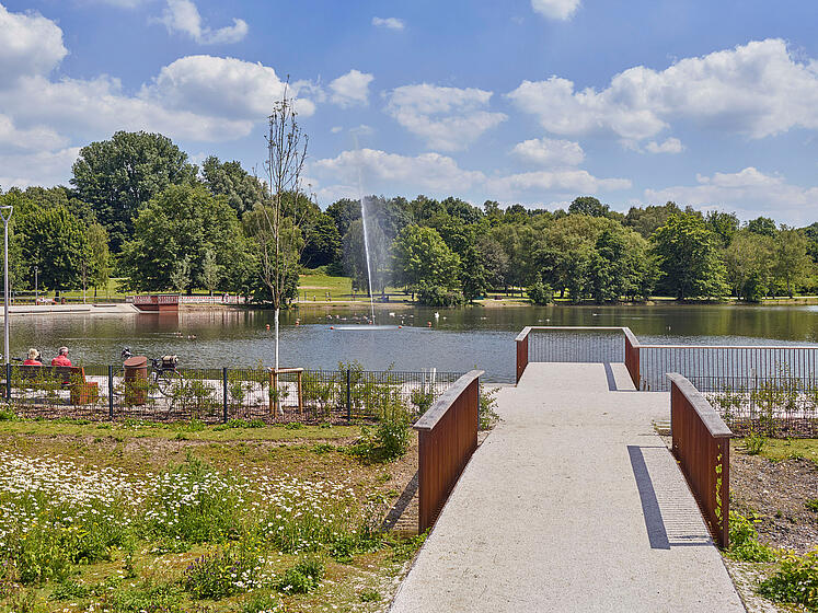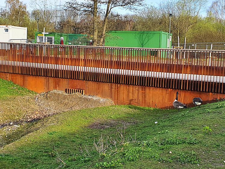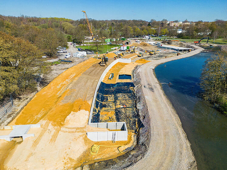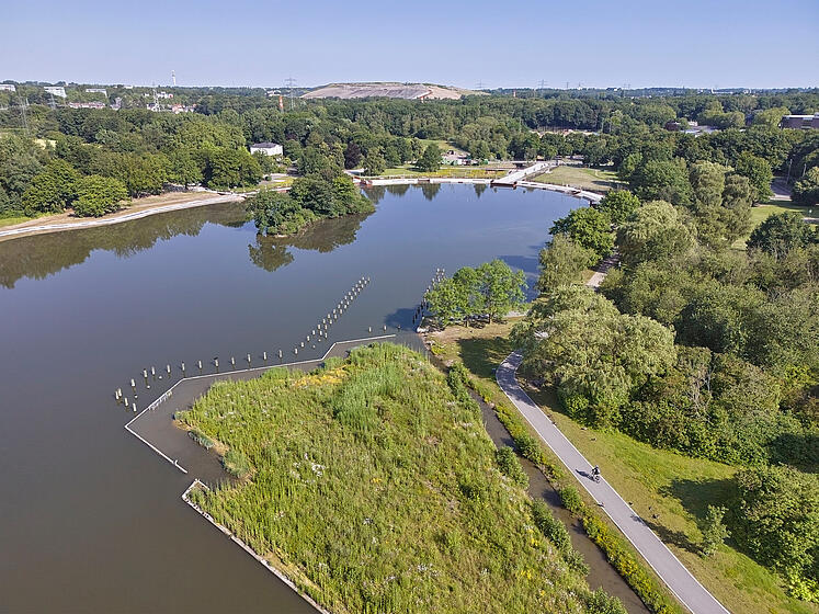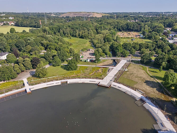 Herstellen einer neuen Uferkante, Integration von Ingenieurbauwerken unter fließender Welle, Ökologische Verbesserung des Harpener Baches (Entkopplung vom See)
