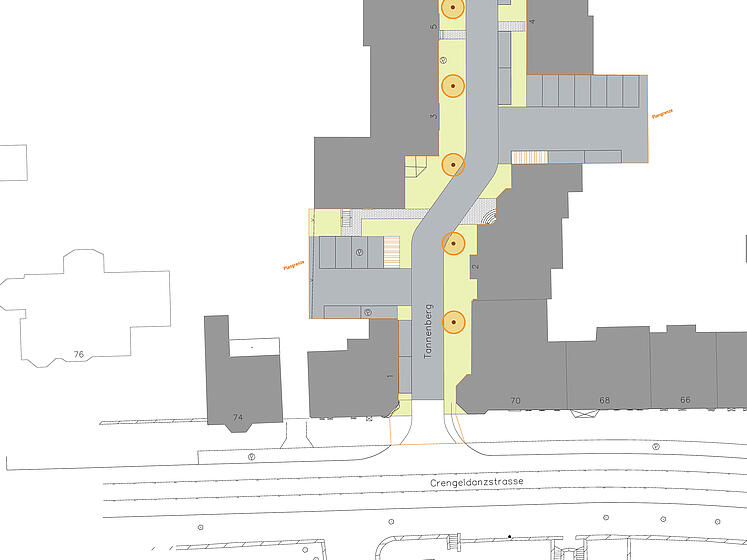 - die barrierefreie und geschwindigkeitsreduzierende Integration des fließenden Verkehrs in das Umfeld