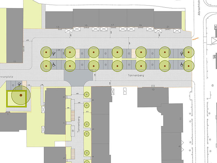 - die Beibehaltung der Anzahl und ungefähre Verteilung der Stellplätze