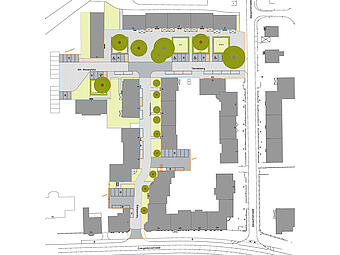 - die Schaffung einer kindersichern und mulitfunktional nutzbaren grünen Mitte (Spiel-, Sitz- und Abstellmöglichkeiten für Rollatoren, angemessene Bewegungsflächen),
