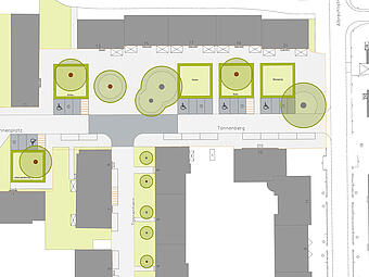 Das Quartier mit seinen großen Innenhöfen (nicht teil der Planungsaufgabe) und dem zum stadträumliche Umfeld klar abgegrenzten "intimen" (halb-) öffentlichen Freiräumen hat ein gutes Potenzial, diesen Ansprüche gerecht zu werden, insbesondere durch die zukunftsweisende Form der privatwirtschaftlich-öffentlichen Zusammenarbeit.